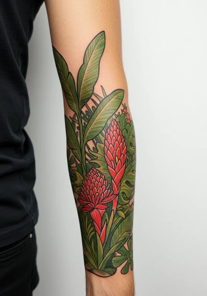 This forearm tattoo is bursting with tropical energy thanks to the bold red torch ginger blooms surrounded by thick banana leaves, monstera, and other jungle greenery. The colors are deep and rich, with strong outlines that give everything a clean, almost cartoon-like pop. The design wraps naturally around the arm, creating that full-coverage sleeve look without feeling too heavy.