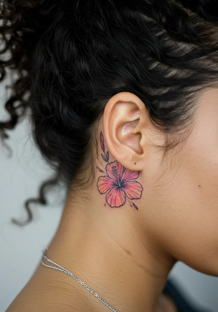 This dainty little hibiscus tattoo is tucked just behind the ear, giving it a playful yet elegant vibe. The flower is softly shaded in warm pink tones, with fine black outlines and tiny leaf accents that keep the design feeling light and airy. It s minimal in size but big on charm, perfectly placed to peek out from behind curls or a messy bun.