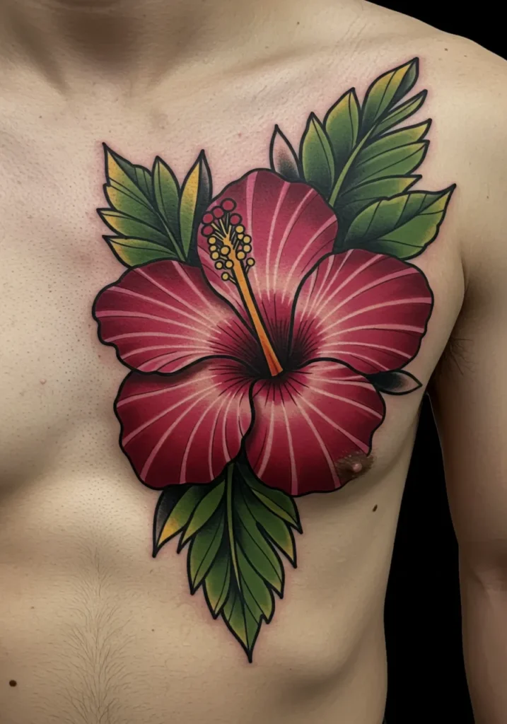 Bold Hibiscus Chest Tattoo With Tropical Leaves