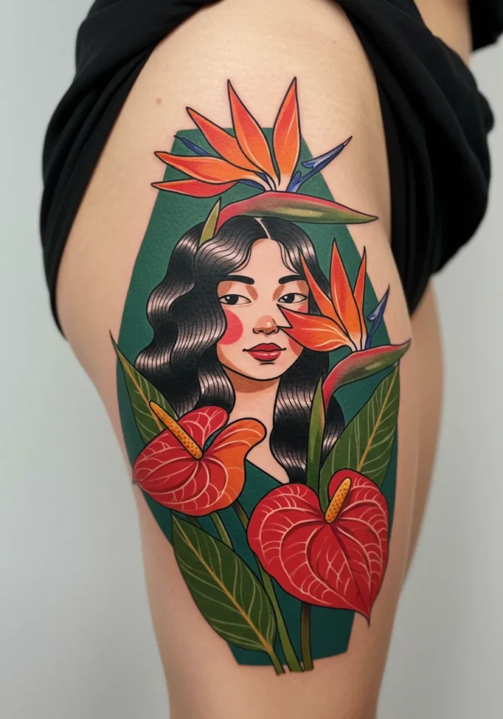 This bold thigh tattoo blends a vibrant tropical garden with a stylized female portrait in a stunning neo traditional art style. Rich reds from the anthuriums, deep greens from the leaves, and the iconic orange bird of paradise bloom all wrap around the central figure whose flowing black hair and soft expression bring a beautiful calm to the whole piece. The use of heavy outlines and solid colors gives it that punchy, graphic vibe that s so eye-catching.