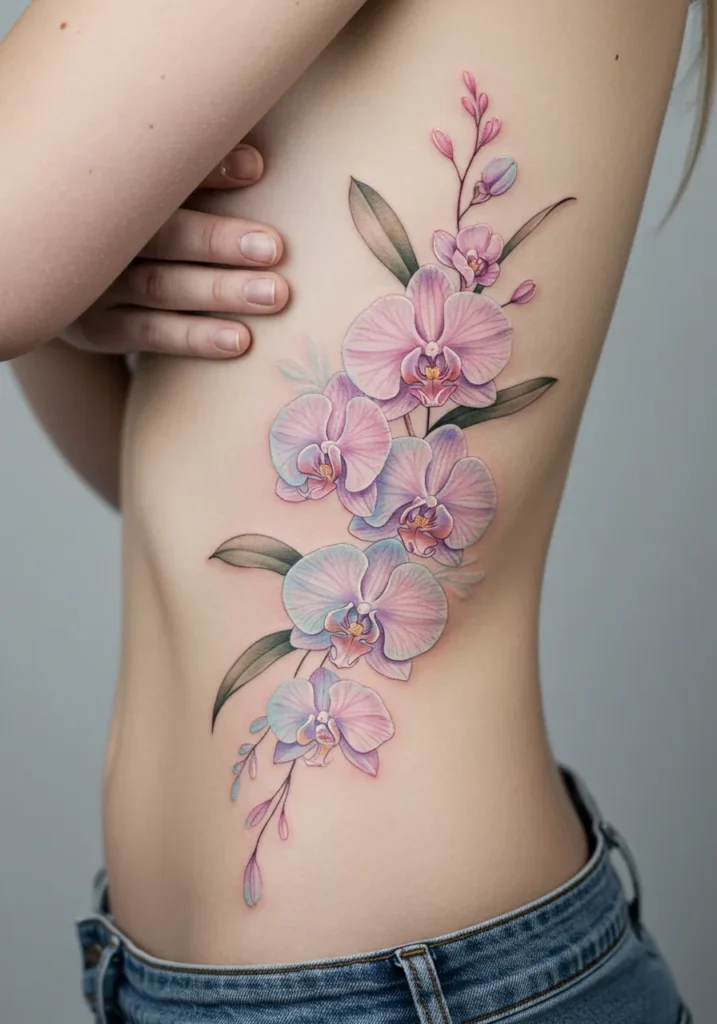Pastel Orchid Rib Tattoo With Watercolor Touches