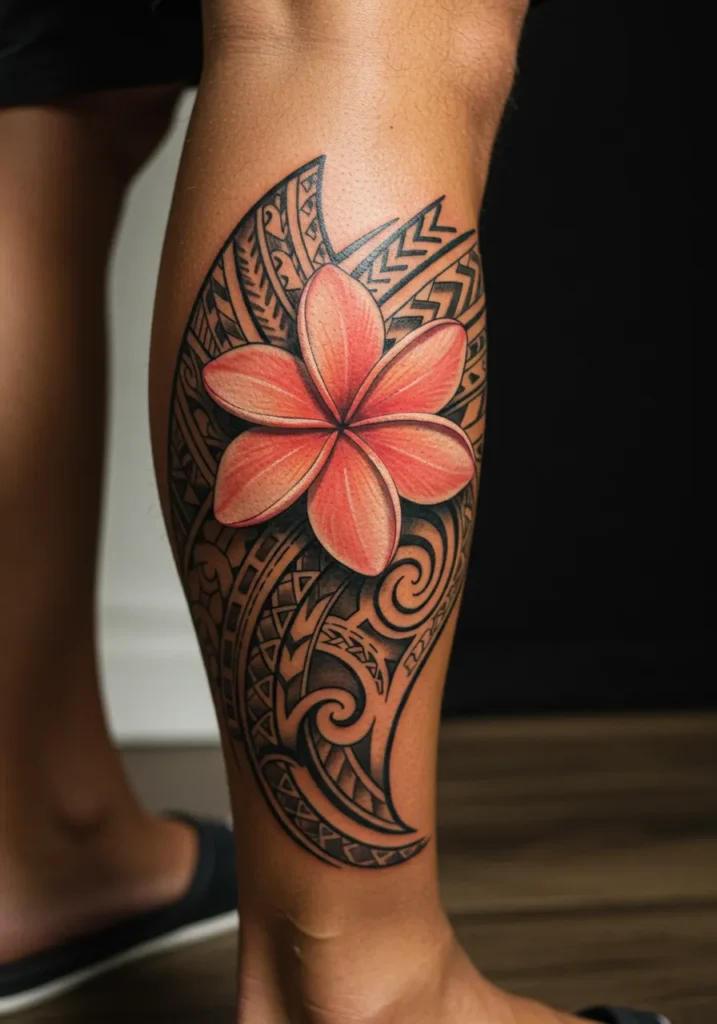 This bold calf tattoo combines the soft elegance of a peach-toned plumeria with the striking geometry of traditional Polynesian tribal patterns. The flower is front and center, softly shaded with coral and cream hues that pop against the rich black ink of the surrounding design. The curved placement wraps beautifully around the calf, making the whole piece feel balanced and cohesive from every angle.