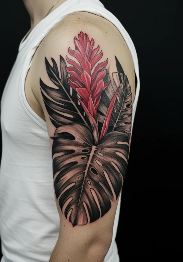 This dramatic half sleeve tattoo showcases a bold red ginger flower rising through layers of large, shadowy monstera leaves. The ginger s deep red tones pop against the muted, almost smoky black and beige of the foliage, creating a striking contrast that instantly draws the eye. The placement along the upper arm gives the whole design a powerful vertical flow, perfect for adding some serious island flair with an edgy twist.