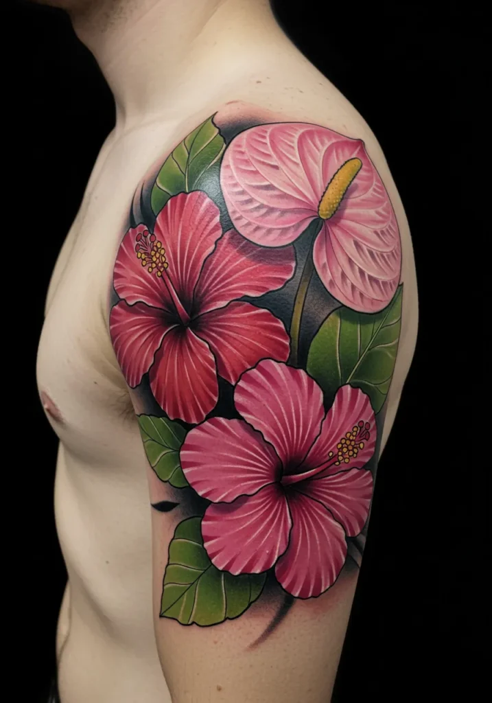 Bold Hibiscus and Anthurium Upper Arm Tattoo