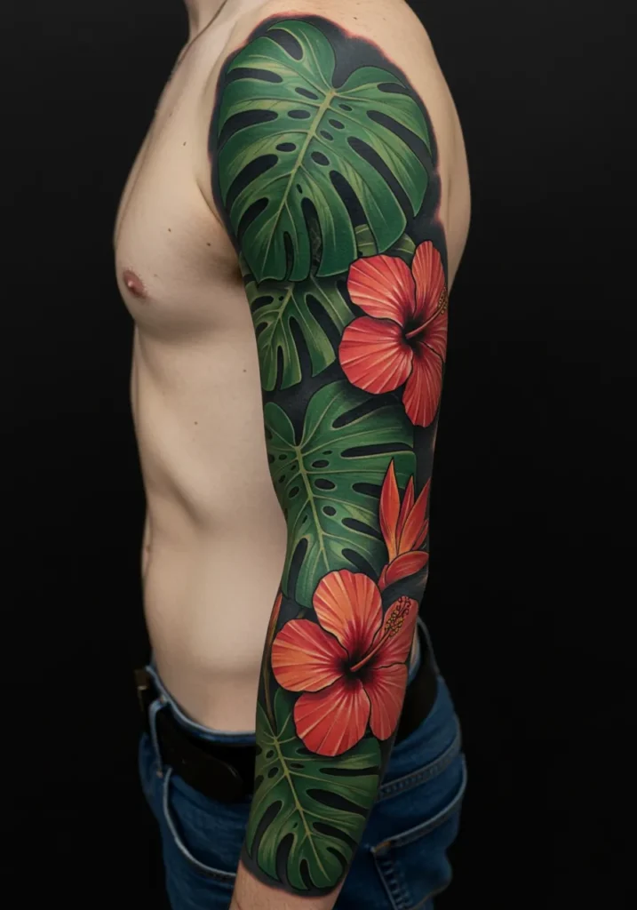 Tropical Full Sleeve Tattoo With Hibiscus and Monstera Leaves