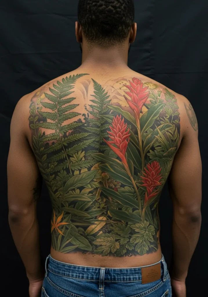 This jaw-dropping full back tattoo transforms the entire back into a lush, layered jungle scene featuring towering red ginger flowers, bold leafy greens, and intricate ferns. The color palette is rich and earthy, with subtle shadows and gradients that give it a deep, immersive look. The composition is seamless, stretching from shoulder to hip like a living tropical forest carved into skin.