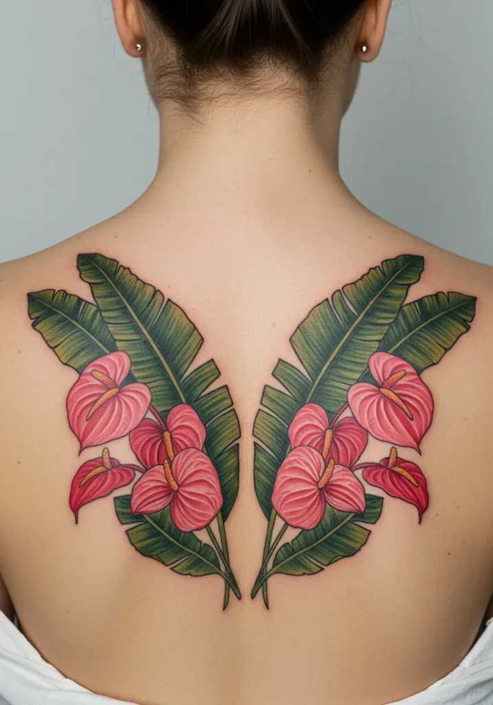 This tropical shoulder blade tattoo set features matching clusters of bright pink anthuriums paired with bold banana leaves, mirrored on each side of the upper back like botanical wings. The shading is rich and velvety, with a clean layout that hugs the natural curve of the shoulders. The symmetry gives it a super balanced, polished look without being overly rigid.