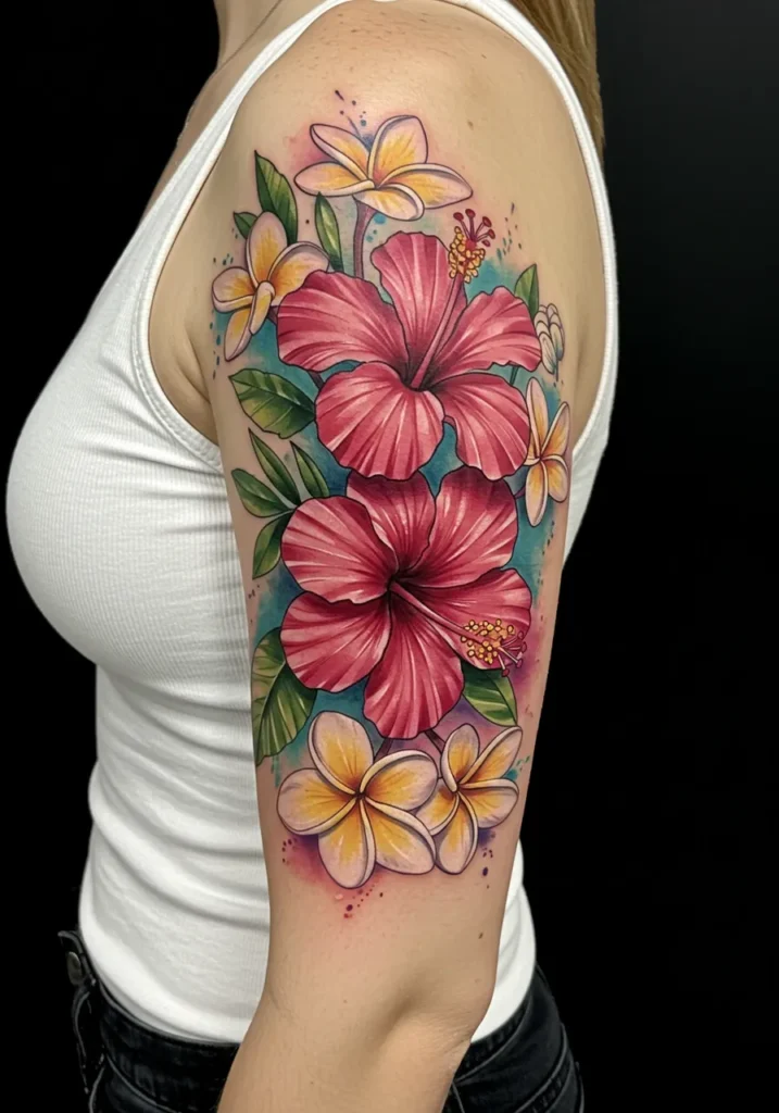 This lively upper arm tattoo features bold red hibiscus blooms surrounded by sunny yellow plumeria flowers and lush green leaves. What gives it that extra punch is the watercolor-style background in teal and pink, adding softness and motion to the design. The layout flows beautifully with the shape of the shoulder and arm, giving it a natural, full-coverage look without feeling too dense.