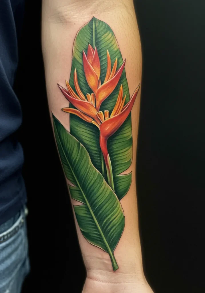 This forearm tattoo shows off a striking heliconia flower nestled between two oversized banana leaves, all wrapped up in hyper-saturated shades of orange, yellow, and green. The level of detail here is next-level, especially in the texture of the leaves and the way the flower petals seem to glow from within. It s placed lengthwise on the forearm so it stretches naturally along the arm, which makes it look sleek and bold at the same time.
