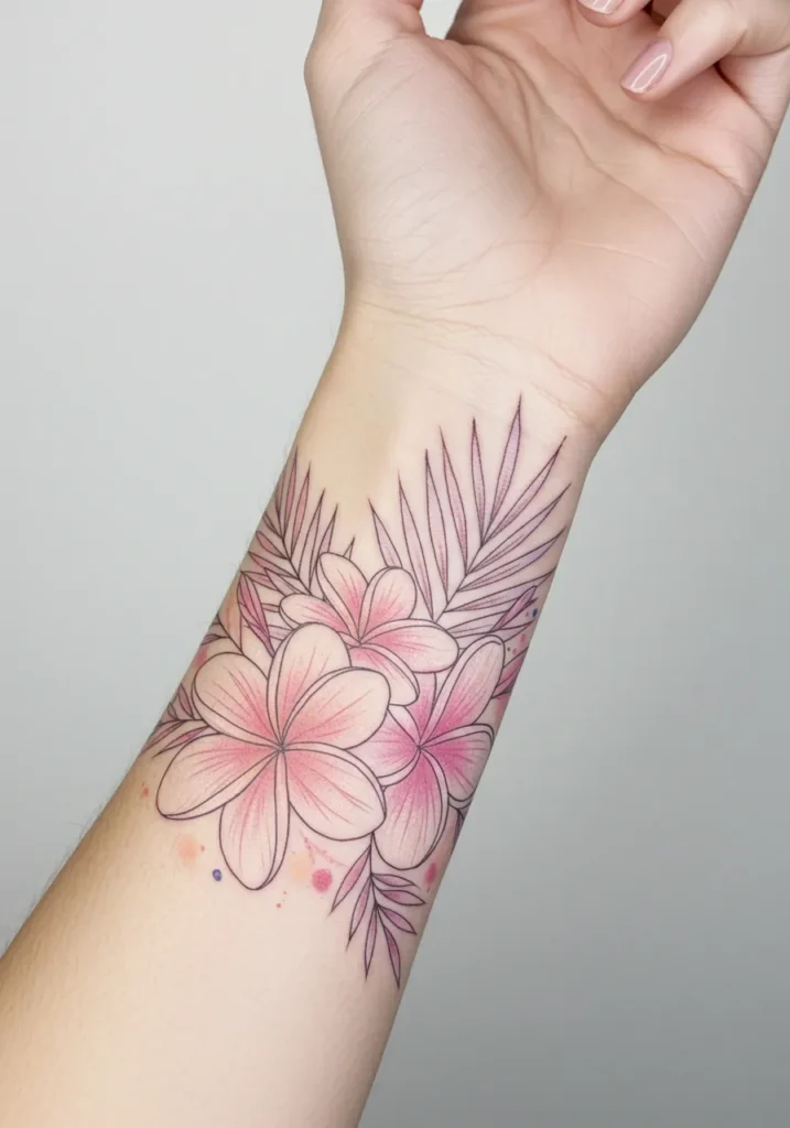 This soft and subtle wrist tattoo features a lovely bunch of plumeria flowers in gentle shades of pink, accented with thinly outlined palm leaves and little watercolor-style dots in coral and purple. The blossoms have a dreamy, brushed look that feels light as air, while the fine lines give it a delicate, feminine touch that s perfect for a more understated look.