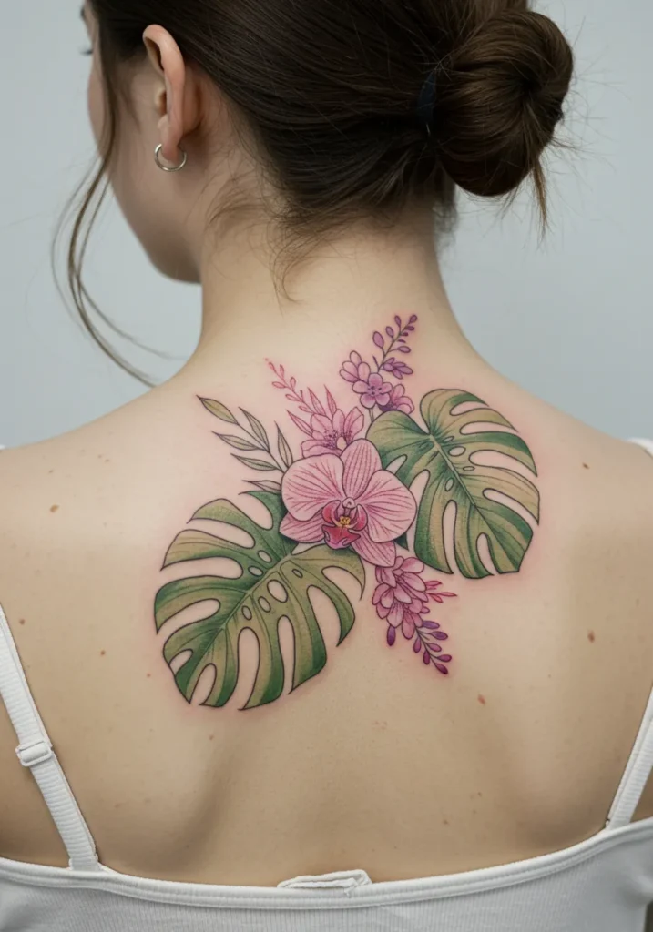 This gorgeous back tattoo brings together soft pink orchids, tropical foliage, and lush monstera leaves in a delicate and feminine design. The placement is centered beautifully between the shoulder blades, allowing the entire floral arrangement to fan out gracefully across the upper back. The color palette is dreamy with pastel pinks, muted greens, and subtle lavender tones that blend together like a watercolor painting.