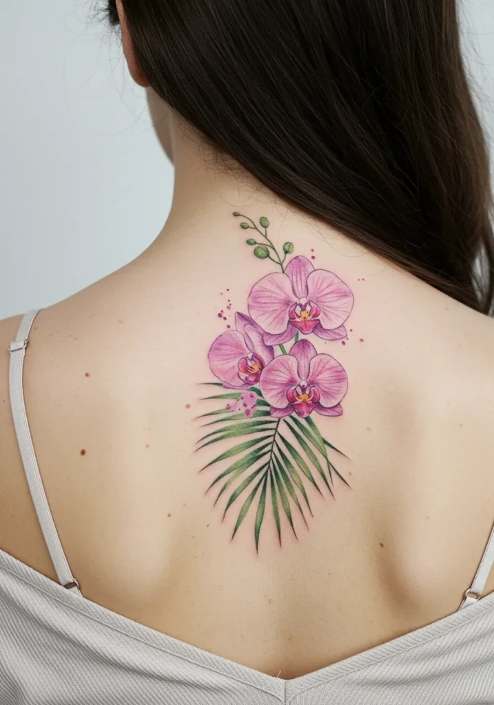 Watercolor Orchid Back Tattoo With Palm Leaf