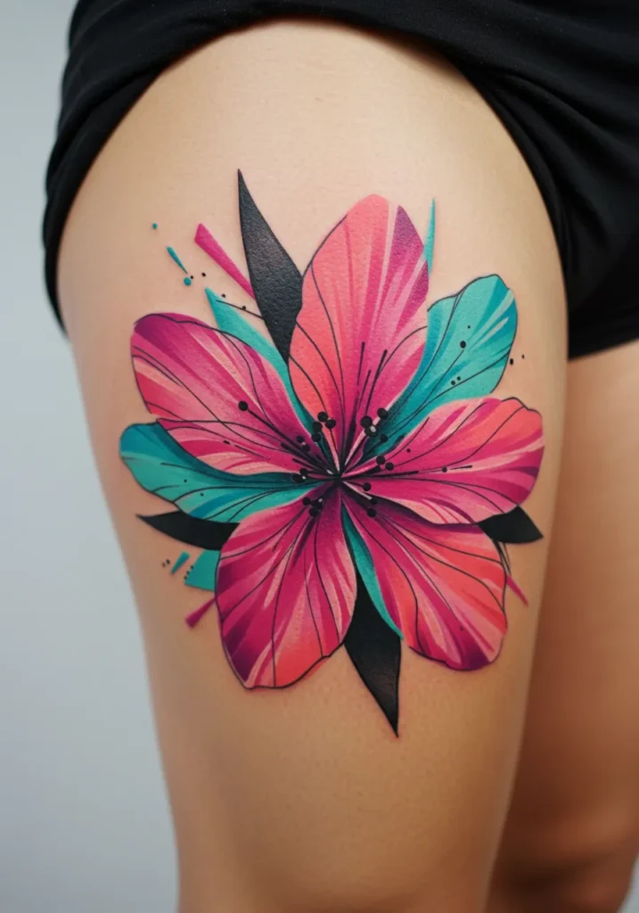 This eye-catching thigh tattoo explodes with energy thanks to its bold mix of neon pinks, purples, and turquoise blues. The tropical flower at the center is a showstopper, with exaggerated petal lines and splashes of black and teal ink that give it a fierce, painterly vibe. The stylized design leans into a watercolor-meets-graphic-art style that s anything but shy.