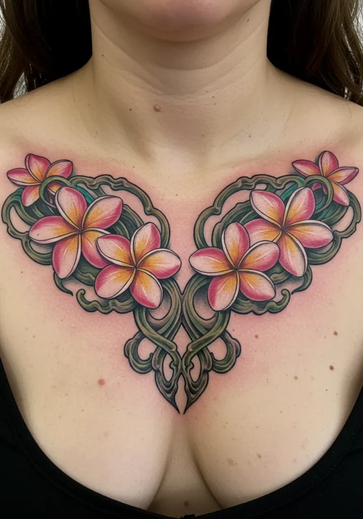 This gorgeous chest tattoo features soft, glowing plumeria flowers in shades of blush pink and golden yellow, nestled in a mirrored ornamental frame that curves beautifully along the collarbones. The swirling green filigree-like background adds depth and elegance, while the flower placement forms a subtle heart shape that feels romantic and powerful all at once.