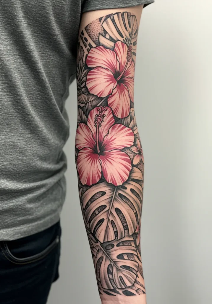 This forearm sleeve tattoo pairs soft pink hibiscus blooms with bold blackwork monstera leaves for a tropical-meets-modern look that totally stands out. The flowers are shaded delicately in pinks and peaches, while the surrounding leaves use heavy dotwork and fine line detailing for that dramatic depth. It s the perfect balance between softness and structure, and the wraparound flow of the design makes it feel seamless and intentional.