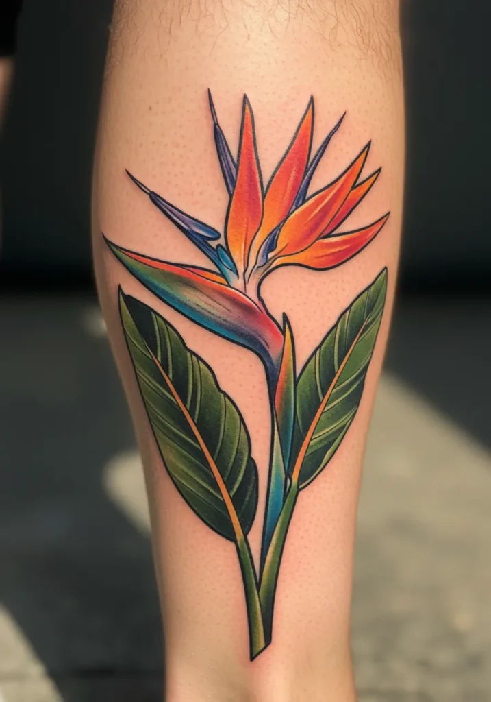This tattoo features a stunning bird of paradise flower, inked in a hyper-realistic style with rich, tropical colors that practically glow. The petals burst in bold shades of orange and fiery red with hints of purple and blue, while the lush green leaves give it that lush, exotic feel. The placement on the calf allows the entire design to stretch and shine without feeling cramped, making every detail stand out perfectly.