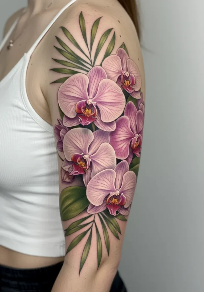 This dreamy half sleeve tattoo is packed with soft pink orchids in full bloom, nestled among lush green leaves and delicate palm fronds. The flowers are so detailed they almost look real, with subtle shading and soft gradients that give them a velvety texture. The layout curves beautifully around the arm, creating a flowing composition that s elegant without being too busy.