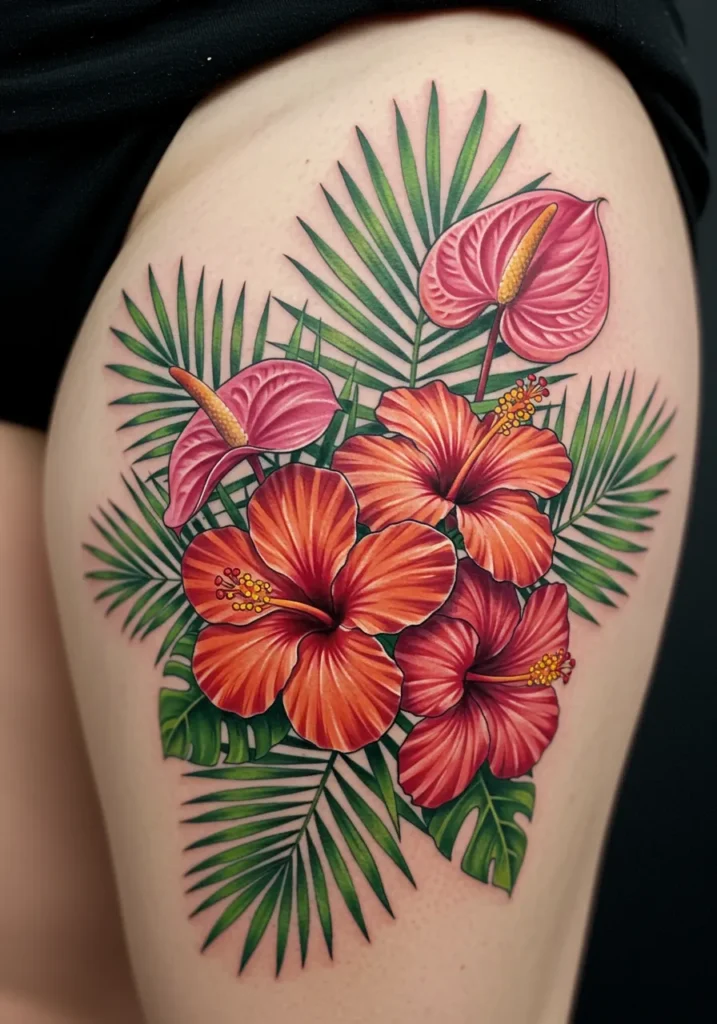 This bold thigh tattoo is an absolute showstopper, featuring a lush cluster of hibiscus and anthurium flowers layered over vibrant palm fronds. The fiery orange and deep red hibiscus blossoms are bursting with life, while the pink anthuriums add a unique shape and glossy texture to the mix. The leafy background ties it all together, creating that perfect tropical bouquet look that s big, bold, and beautifully balanced.