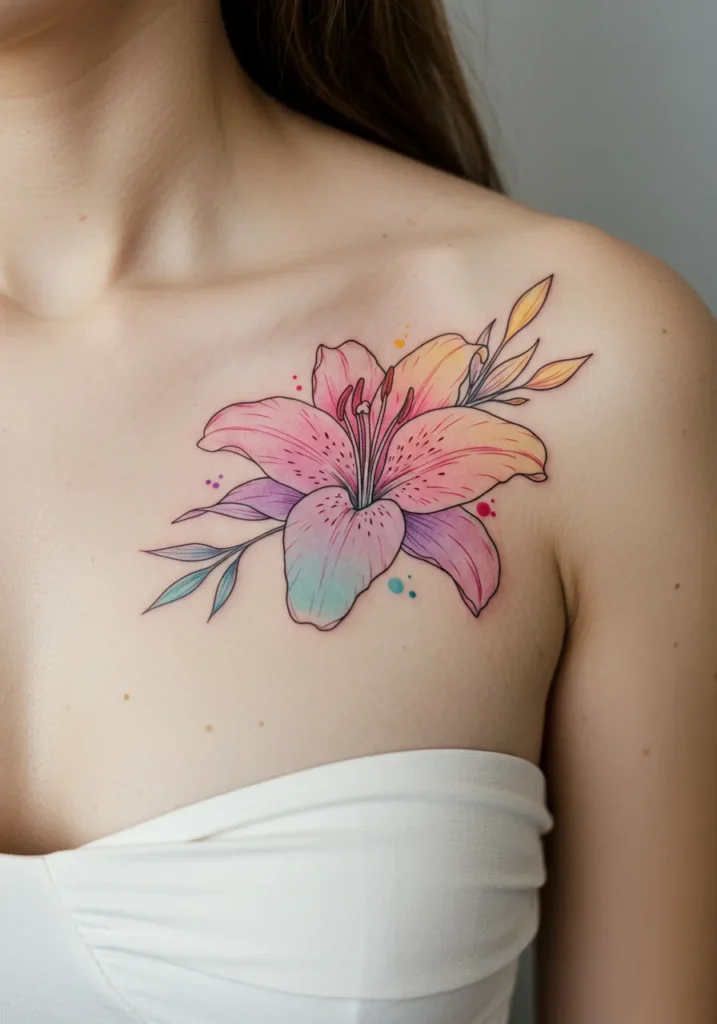 This stunning tattoo bursts with personality, featuring a large lily on the shoulder that melts from pink into purple, then flows into dreamy blues and soft greens. The petals are outlined in fine lines that give structure to the soft watercolor blend, while subtle splashes of ink dot the background for a playful finish. There s movement and color, but the design still feels light and airy thanks to the balanced composition and delicate linework.