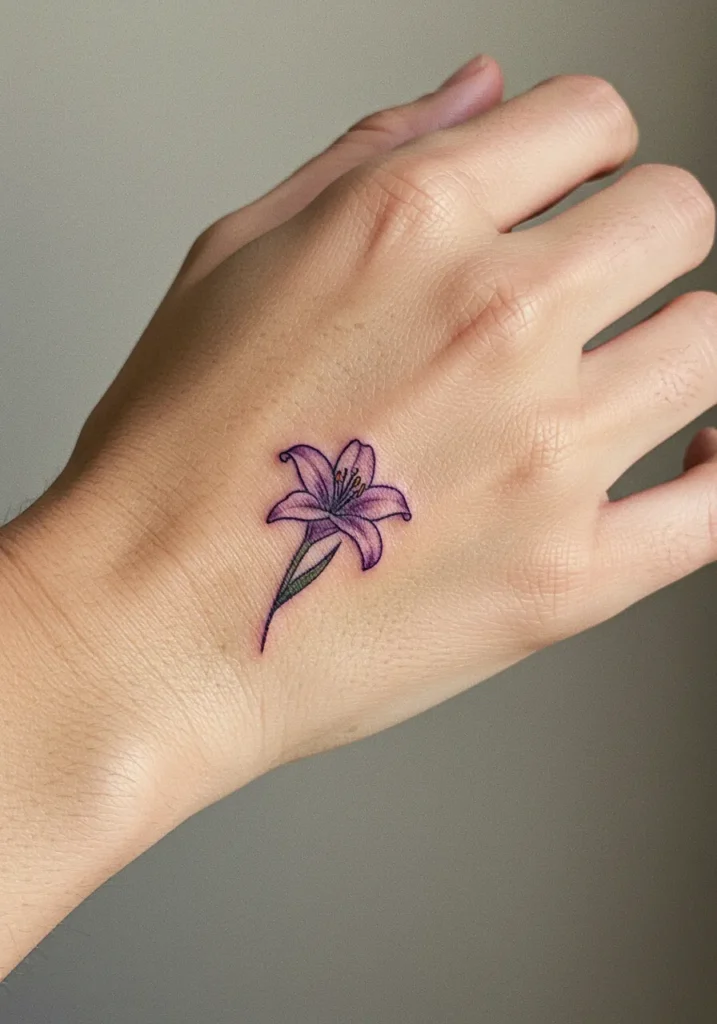 This petite tattoo features a single, delicate lily bloom placed neatly on the back of the hand. Fine black lines outline the flower and its short stem with a single leaf. The petals are filled with a lovely shade of purple, while the stem and leaf add a touch of green contrast. Its small size makes it a subtle yet noticeable adornment in this prominent location.