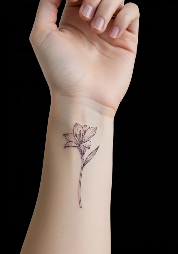 Here we have a beautifully simple lily tattoo placed delicately on the inner wrist. This design features a single, elegant lily bloom with a slender stem and one leaf, all created using fine black linework. There s minimal shading, allowing the clean lines to define the flower s shape and details like the petals and stamens. Its vertical orientation follows the line of the forearm gracefully.