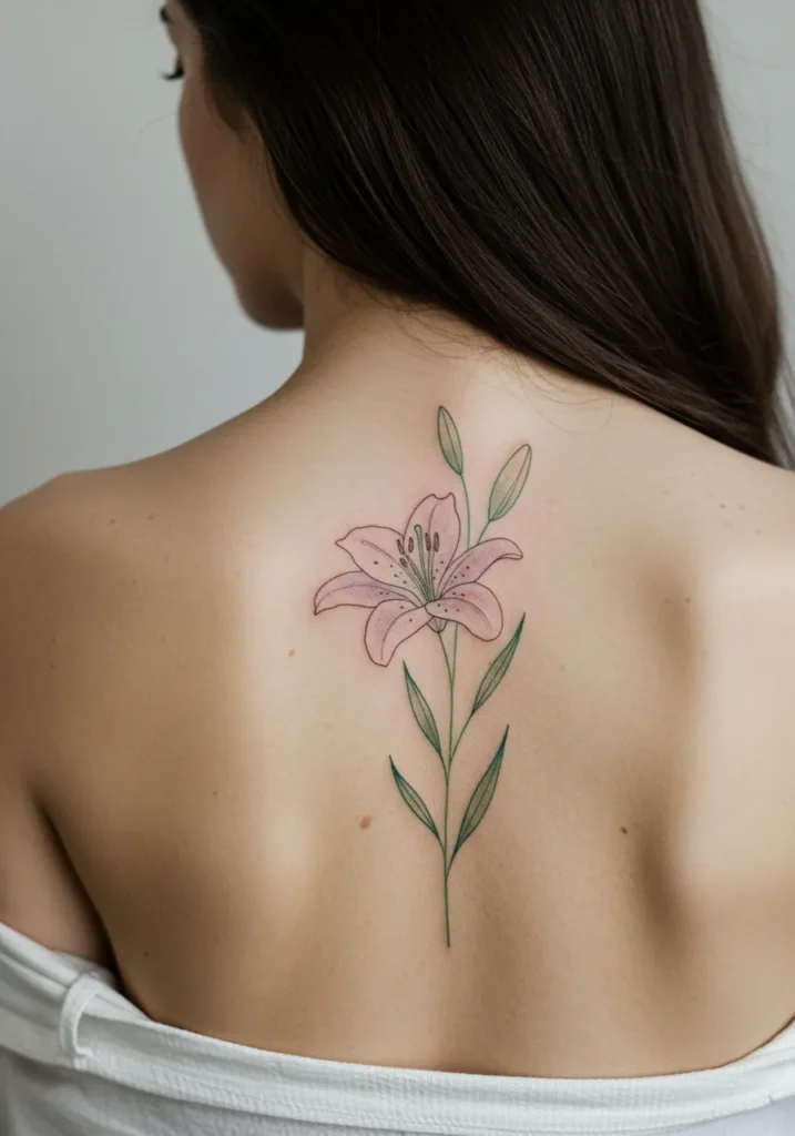 This elegant back tattoo features a single blooming lily with soft pink petals, supported by a tall slender stem and a cascade of green leaves. The design is placed perfectly along the spine, giving it a natural, vertical flow that flatters the back beautifully. The fine line style adds that delicate touch, while the subtle color shading keeps everything light and graceful. There s just the right balance between simplicity and detail, and the shape hugs the body in such a flattering way.