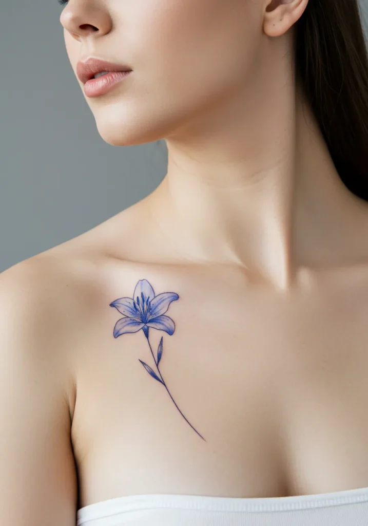 This delicate collarbone tattoo features a fine line lily inked in soft shades of blue, and it s giving ethereal energy in the best way. The petals are detailed but airy, almost like they were brushed on with watercolor, and the thin stem extends downward in a clean graceful curve. The placement is spot on, sitting right above the heart and flowing with the natural line of the body. It s simple, elegant, and has just enough color to make it feel unique without stealing the show.