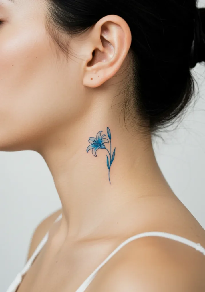I think this is such a sweet and subtle placement! The vibrant blue color is unexpected for a lily but looks absolutely gorgeous against the skin. It s small enough to feel delicate and easily concealable if needed, yet the color makes it pop beautifully. It s a really lovely way to wear a floral design, adding a touch of personal artistry in a graceful spot.