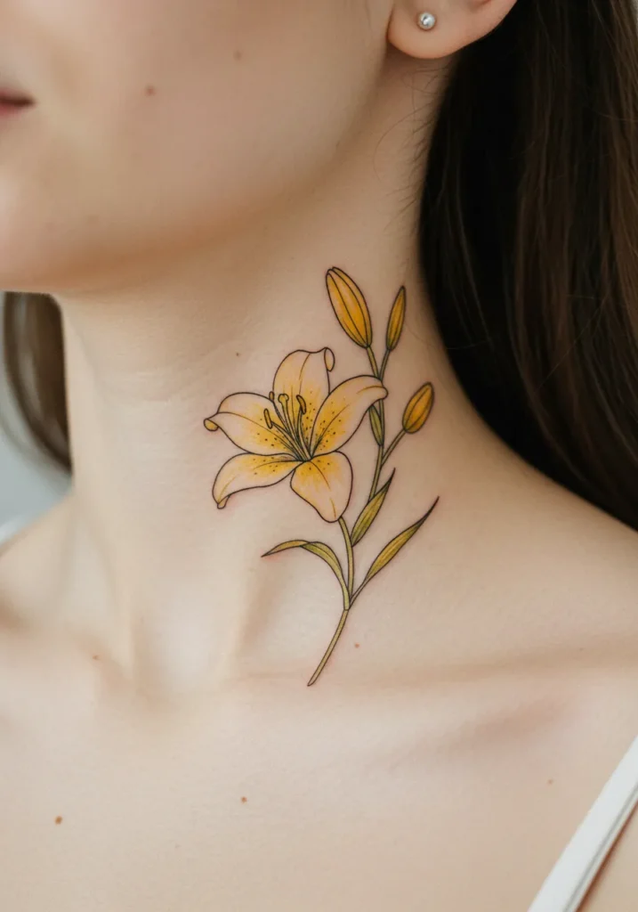 This neck tattoo features a stunning yellow lily inked in soft watercolor tones and outlined with crisp fine lines. The flower is fully bloomed, with gentle gradients that bring out the texture in every petal. Several buds branch upward beside it, adding a natural sense of movement and growth. The stem curves down toward the collarbone, giving the whole piece a graceful flow that works beautifully with the natural lines of the neck and shoulder.