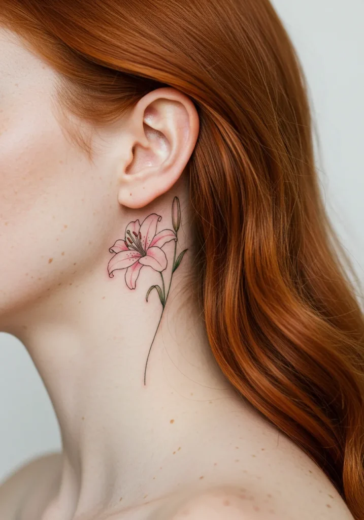 This dainty tattoo sits just behind the ear and features a soft pink lily drawn in fine line style with whisper-thin strokes and gentle watercolor shading. The petals are delicate and slightly curled, giving the flower a light, natural movement. The green stem and bud extend downward along the neck, following the shape of the jawline and adding a subtle vertical elegance. It s one of those tattoos that feels like a secret bloom only revealed when your hair moves just right.