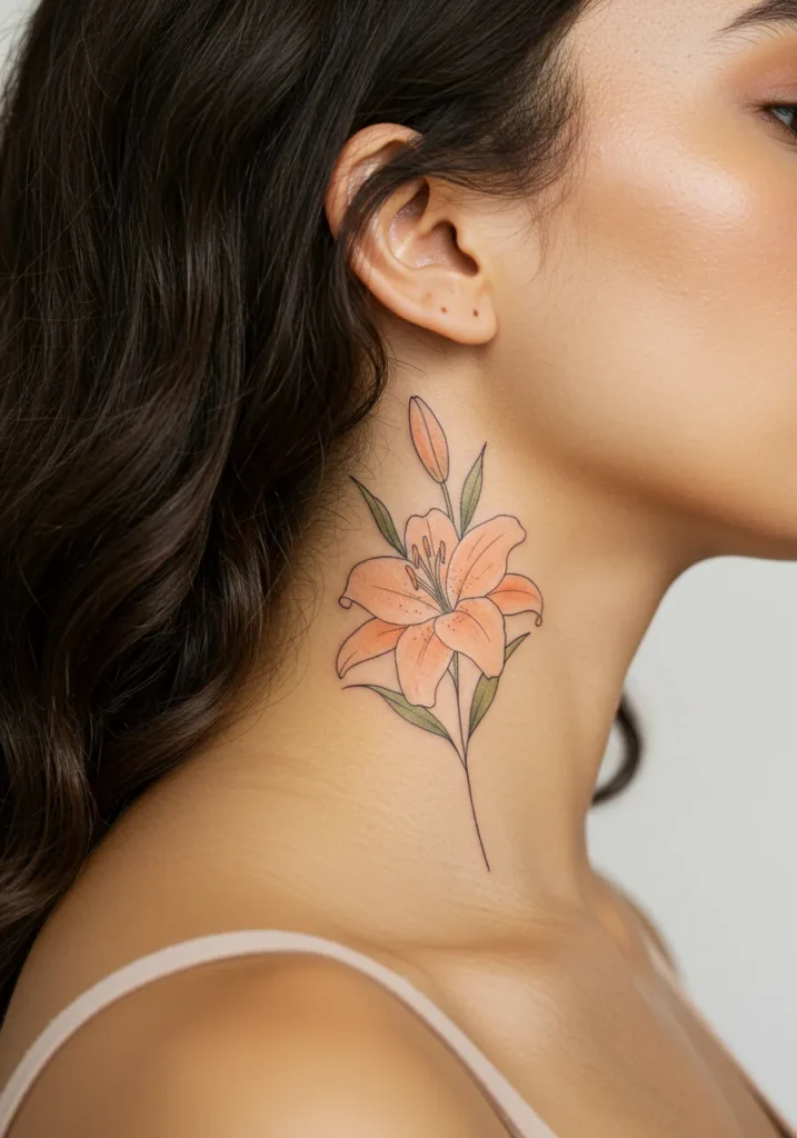 This beautiful tattoo wraps the side of the neck with a soft peach lily in full bloom, drawn in graceful fine lines and light watercolor shading. The petals have subtle pink undertones, with gentle dots bringing texture to the center of the flower. The green leaves and buds stretch upward toward the ear and downward into a thin stem, following the natural line of the neck in the most flattering way. It s delicate but still has presence, making it a perfect balance of bold and feminine.