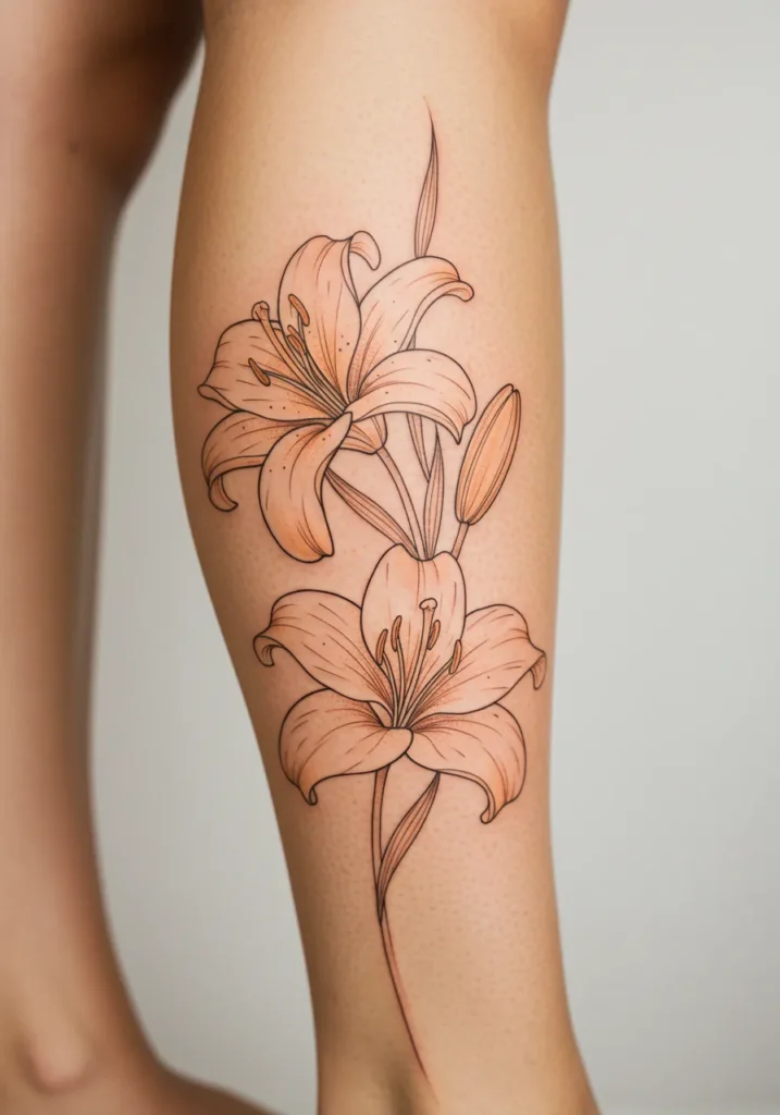 This gorgeous tattoo features a stem with two fully bloomed lilies and a couple of buds, elegantly inked along the calf. The artist employed crisp, dark fine lines to outline the petals, stamen, and stem, creating a clear and defined look. A soft, warm peach color fills the blooms, applied with subtle shading that gives the flowers dimension without appearing too heavy. Tiny dots detail the inner petals, adding a touch of realism.