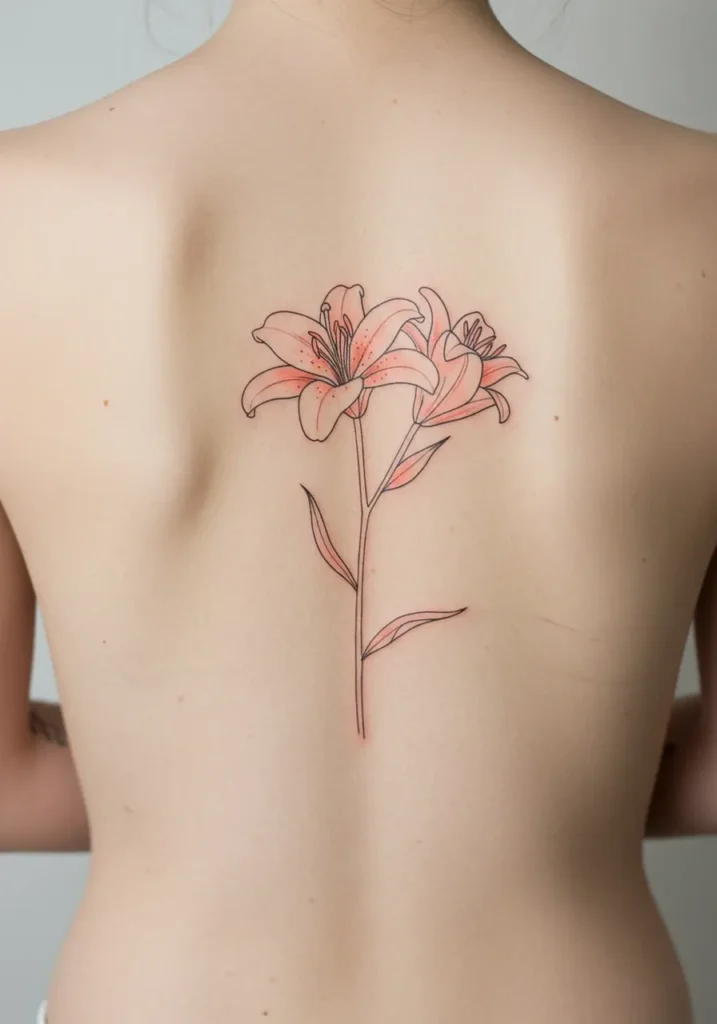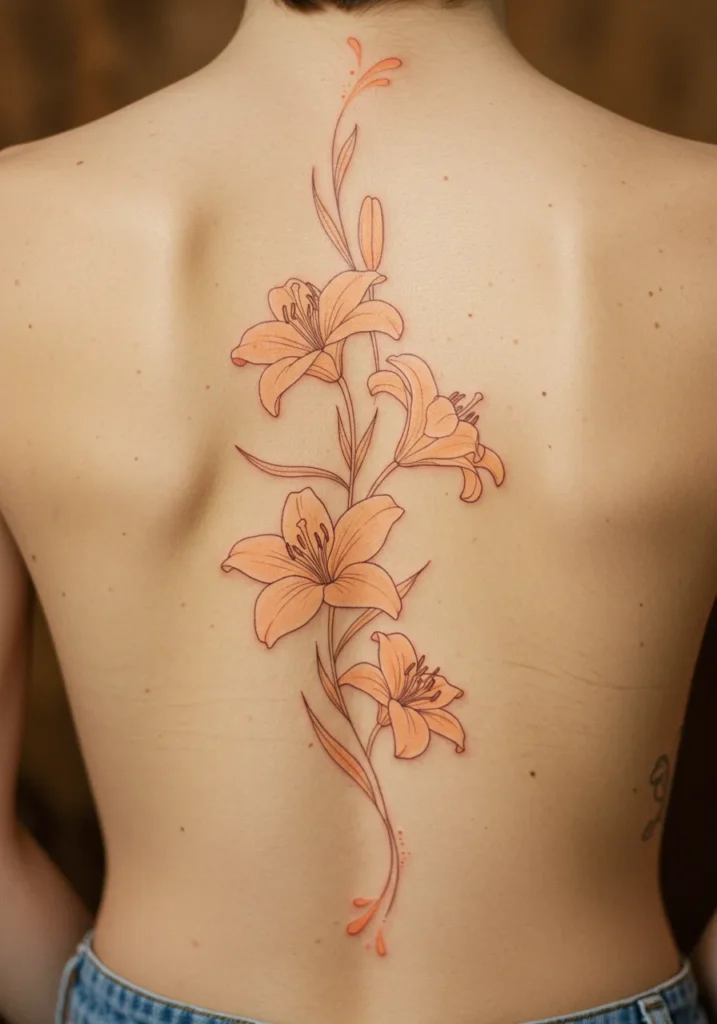 I think spine tattoos are incredibly elegant, and this lily design is just perfect for that placement! It s delicate and feminine, drawing the eye without being overwhelming. The fine lines give it such a sophisticated feel, and the warm peach color adds a lovely touch of softness. It feels both classic and contemporary, a really stunning choice for a back tattoo.