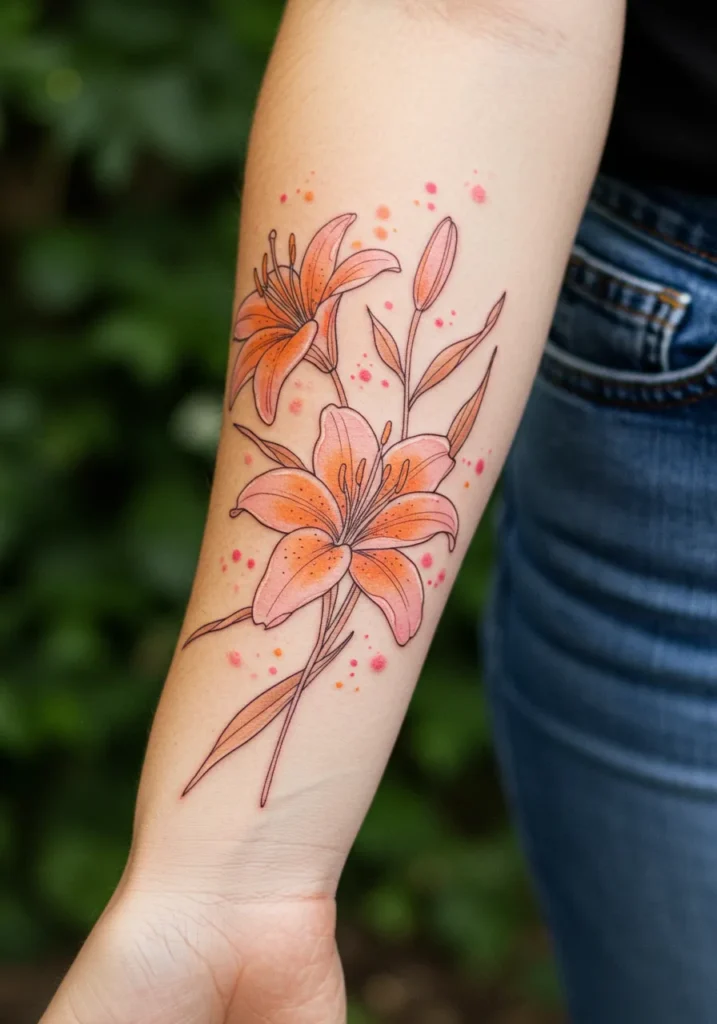 This vibrant forearm tattoo showcases a lovely spray of lilies, featuring two open blossoms and delicate buds. Fine, clean lines define the flowers and stems, while soft washes of peach and pink hues bring the petals to life with a gentle gradient effect. Adding a playful, artistic touch, small dots of pink and orange ink are scattered around the blooms, resembling watercolor splatters.