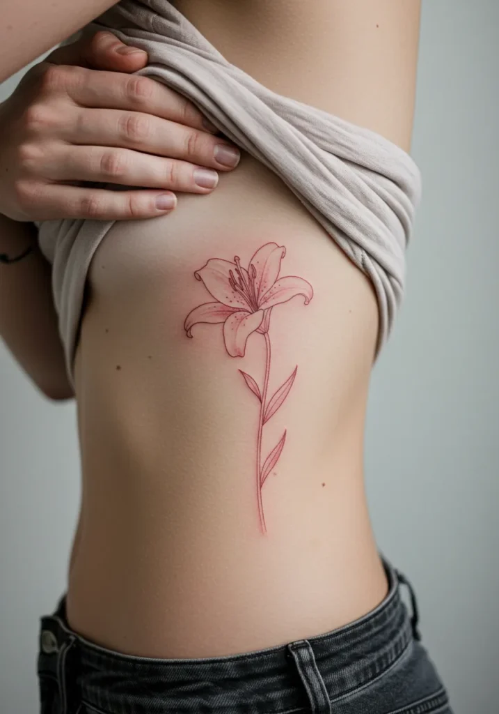 This ribcage tattoo is a total stunner with its soft red ink and graceful fine line structure. The lily stretches vertically with just the right flow, starting at the ribs and trailing gently downward with a long, delicate stem and a few simple leaves. The bloom itself is open and detailed, with tiny dots that add a light, textured feel to the center. The overall look is clean, feminine, and surprisingly bold for something so minimal.