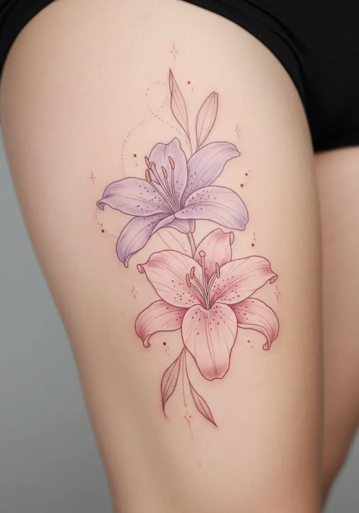 This dreamy tattoo features two lily blossoms stacked in a vertical flow, one in soft violet and the other in blush pink. Each petal is drawn in a delicate fine line style with just the right amount of gradient shading to give them a watercolor-like glow. There are tiny dotted accents and sparkly star elements around the flowers that add a magical touch without being too much. The composition flows beautifully with the natural curve of the thigh, making the entire piece feel balanced and intentional.