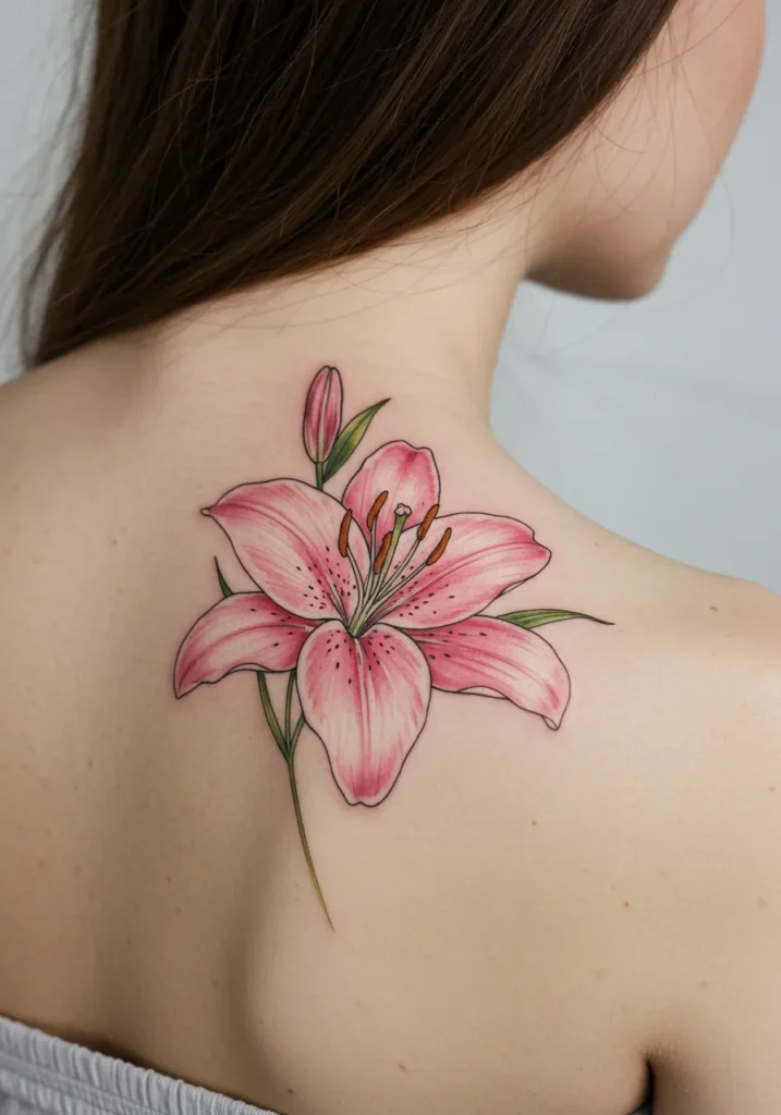 This lovely tattoo is beautifully placed on the shoulder blade, showcasing a single, vibrant pink lily in full bloom, complete with a small bud and delicate green leaves. Crisp fine lines outline the flower, while expert shading gives the pink petals a soft, realistic dimension. Tiny black dots add detail to the petals, and warm orange stamens provide a nice contrast against the pink. The stem and leaves are rendered in complementary green tones.