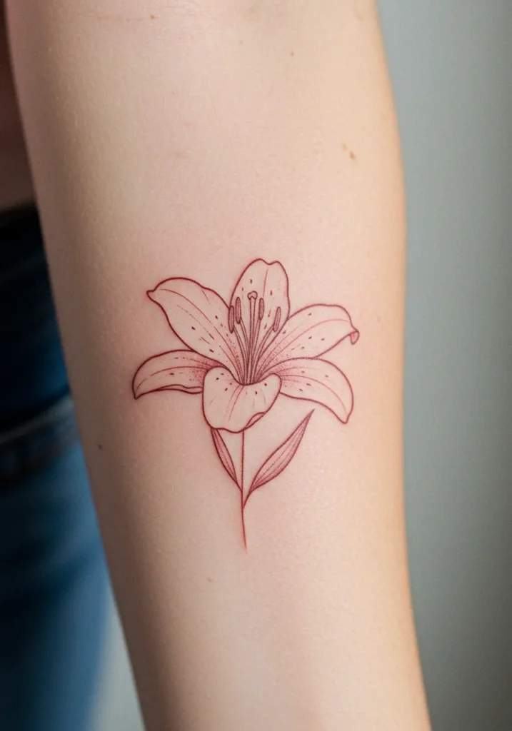This tattoo showcases a single, beautifully rendered lily placed on the inner arm. What makes it stand out is the use of exclusively red ink for the entire design. Delicate fine lines trace the outline of the bloom, its stem, and a single leaf. Subtle shading and dot work, also in red, add depth to the petals and center of the flower, giving it dimension while maintaining a minimalist aesthetic.