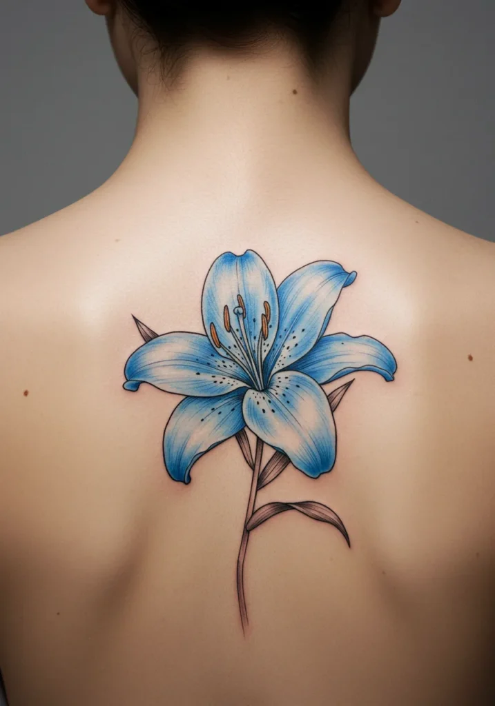 This absolutely gorgeous tattoo showcases a single, large lily bloom taking center stage on the upper back. Bold black fine lines define the elegant shape of the petals, stem, and leaves. The flower itself bursts with vibrant blue color, featuring impressive shading that adds depth and realism, transitioning from lighter edges to deeper blues near the center. Tiny black dots speckle the petals, and contrasting orange stamens add a pop of warmth, while the stem and leaves are inked in a darker, muted tone.