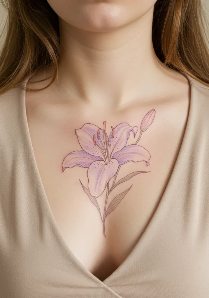 This beautiful tattoo features a single lily stem placed elegantly right in the center of the chest. Delicate, fine lines in a slightly darker purple hue outline the main bloom, a smaller bud, slender leaves, and the stem. The petals are filled with a soft, watercolour like wash of lavender purple, giving it a gentle and ethereal appearance. The details like the stamen and the subtle shading on the petals are rendered with beautiful precision.