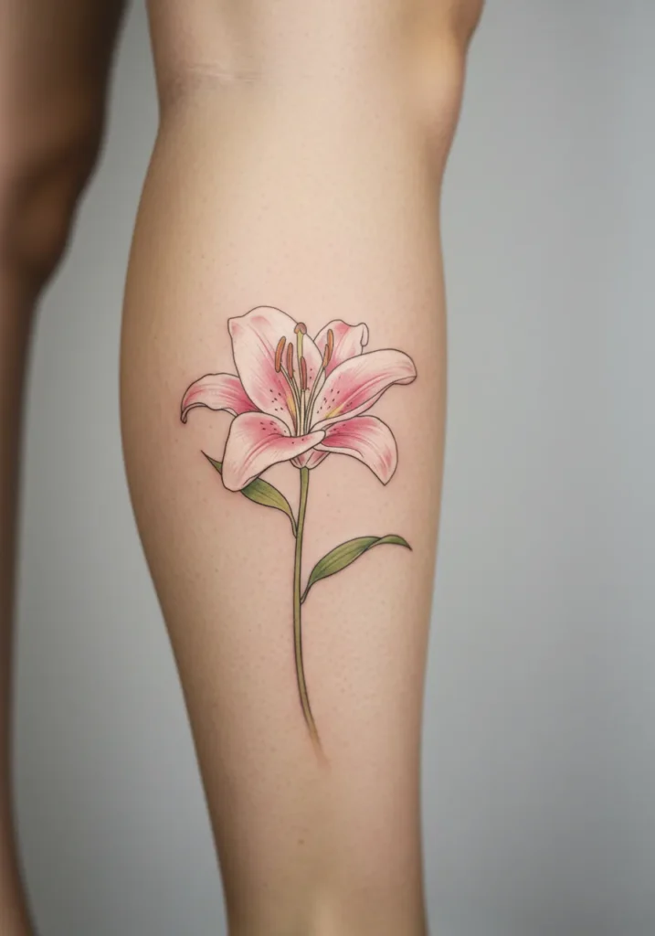 This tattoo is a gorgeous example of how simple lines and soft colors can create something truly elegant. The lily is inked in fine line style with delicate black outlines and the prettiest blush pink petals. There s just the right amount of shading to give it a lifelike depth without making it feel heavy. The stem flows straight down the calf with two gently curved green leaves that keep the whole design feeling balanced and airy. It s feminine without being overly detailed, and honestly, it s just so pleasing to look at.