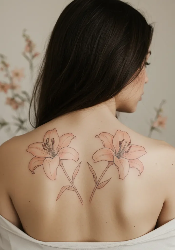 This stunning back piece features two identical lily flowers, perfectly mirrored on each shoulder blade. The design utilizes delicate fine lines to outline the graceful petals, stems, and intricate stamen details. Each lily is softly shaded with a beautiful warm peach color, giving them a gentle yet vibrant appearance. The symmetrical placement creates a sense of balance and harmony across the upper back.