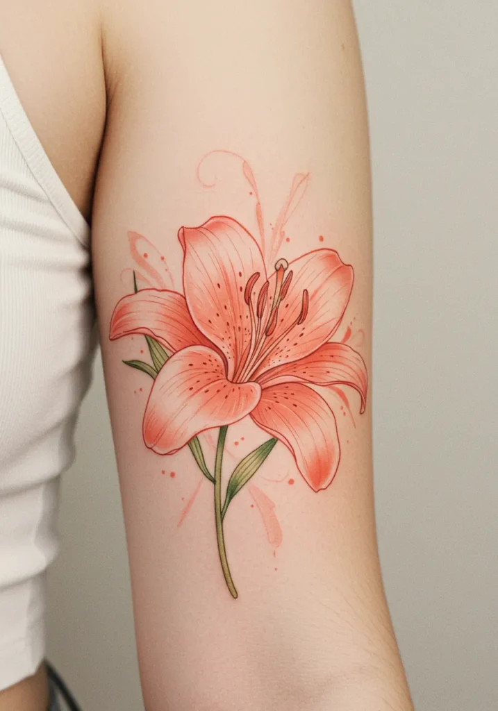 This bright and bold tattoo features a vibrant coral lily blooming on the outer arm, with soft watercolor-style splashes dancing around it. The petals are full and luscious, each one shaded with gentle gradients that bring the whole flower to life. The stem is slender with two leafy greens at the base, and the background has just the right touch of artistic chaos with those free-flowing coral brushstrokes and ink drops. It s fine line work at its most expressive, combining delicate outlines with a pop of lively color.