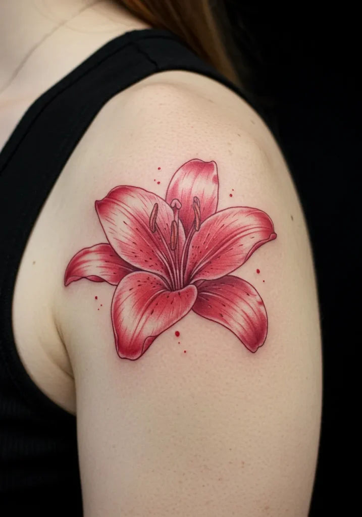 This bold shoulder piece features a rich red lily blooming right across the top of the arm. It s done in a fine line style but with vibrant shading that gives it extra drama and depth. The petals are full and curved, each one detailed with subtle black lines that make the flower look alive and dimensional. There are tiny red dots around the flower that give it a soft, splashy glow without taking attention away from the main design.