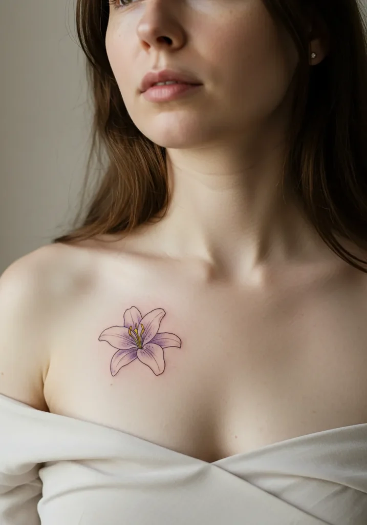 This delicate tattoo features a single lily bloom placed beautifully on the collarbone area. The design focuses solely on the flower head, without a visible stem or leaves, giving it a clean and focused look. Fine black lines define the petals and yellow stamens, while a soft wash of lavender purple fills the petals with subtle shading near the center for dimension.