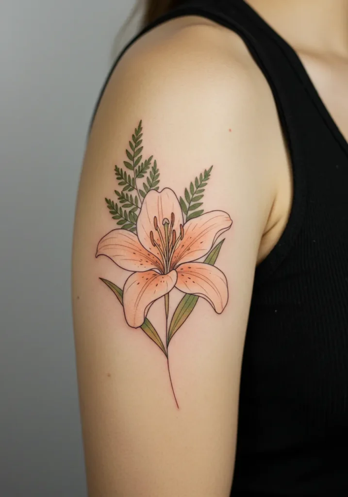 This design features a soft peach-colored lily in full bloom, accented by delicate fine line work and beautifully layered green foliage. The fern fronds in the background add a subtle forest vibe while still keeping everything light and balanced. The flower petals have just the right amount of blush shading to give it dimension without overwhelming the look. It s placed perfectly on the upper arm where the curves of the flower follow the natural shape of the shoulder.