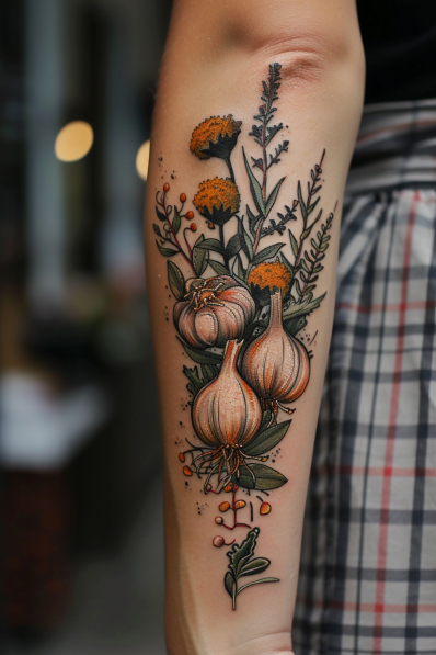 Now, I have to say, this tattoo is a total masterpiece for anyone who s got a love affair with cooking, especially if you re into the earthy, fresh flavors of garlic and herbs. It s like carrying a little kitchen garden with you wherever you go! The detail here is just next level, and it s the kind of design that s bound to start some conversations. Plus, who wouldn t want to show off their culinary pride in such a creative and unique way? This one s definitely for the chefs and foodies who appreciate the beauty in the basics.