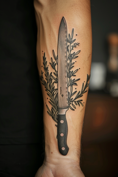 This striking tattoo features a sharp chef s knife, perfectly paired with a sprig of rosemary, inked in a dark art style on the forearm. The knife is rendered with clean lines and a slightly worn, realistic texture, giving it a well-used and trusted appearance. The rosemary sprig wraps around the blade, with delicate leaves and stems that contrast beautifully with the starkness of the knife. The dark shading adds depth and intensity to the design, making it pop against the skin.
