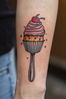 I absolutely love how this tattoo combines the joy of baking with a dash of creativity. It s perfect for anyone with a sweet tooth or a passion for whipping up delicious treats. The forearm placement makes it easily visible, allowing you to show off your love for all things sweet and fun. The whimsical nature of the design adds a light-hearted vibe, making it a delightful conversation starter. Whether you re a professional baker or just someone who enjoys a good cupcake, this tattoo is a sweet way to celebrate your love for dessert!