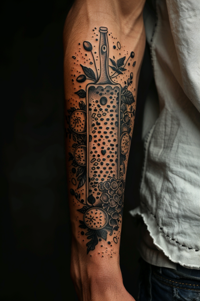 I have to say, this tattoo is seriously cool for anyone who s into cooking, especially if you appreciate the tools that make it all happen. The grater is such a humble yet essential kitchen tool, and pairing it with citrus slices adds a zesty, refreshing twist. I love how the dark, detailed style gives the tattoo a bit of an edge while still keeping it connected to the culinary world. The forearm placement is spot-on for this long, vertical design, making it easy to admire every detail. If you re looking for a tattoo that s both practical and creative, this one really grates in all the right ways!